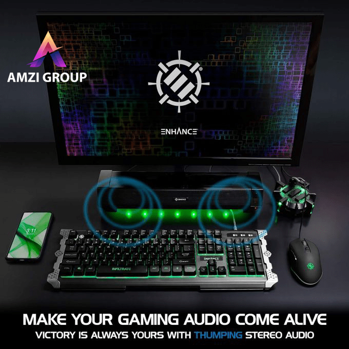 La nouvelle barre de son ENHANCE Attack Under Monitor avec lumières LED a été conçue pour les joueurs sur PC. L’ENHANCE Attack est une barre de son élégante avec une finition noire brillante qui complétera parfaitement votre configuration de jeu sur PC. Grâce à sa conception discrète, le haut-parleur d’ordinateur de jeu ENHANCE peut être placé sous l’écran de votre moniteur pour profiter de l’espace inutilisé.